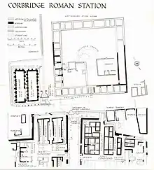 Between 1906 and 1914, the site was excavated following a desire by the Northumberland County History Committee to assess the Roman remains at Corbridge ahead of a book on the history of the parish, overseen by Francis J. Haverfield. During that time, a number of scholars from Oxford University were sent by Haverfield to supervise local labourers tasked with the actual excavation, including J.P. Bushe-Fox and Leonard Woolley, making it one of the first training excavations in British archaeology.[8] Brian Dobson later ran adult training excavations at Corbridge in the 1960s and 1970s.[6][9]