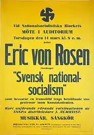 Poster from the National Socialist Bloc, announcing a 1935 meeting with von Rosen as its main speaker.