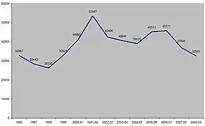 Knife-enabled crime figures are available from 2003 to 2007 and more recently monthly knife crime summaries are provided on the Metropolitan Police website showing financial year to date figures.[46] Knife enabled offences increased from 2003 to 2004 and from then on saw annual reductions until 2007. It was not possible to retrieve statistics for 2008 and 2009.