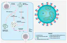 Crimean–Congo hemorrhagic fever virus (CCHFV) virion and replication cycle.