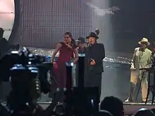 Kraljevi ulice and 75 Cents took part in technical rehearsals on 14 and 18 May, followed by dress rehearsals on 21 and 22 May.[31] The Croatian performance featured the members of Kraljevi ulice all dressed in dark and 75 Cents dressed in a white suit and wearing a white hat. The performers' outfits were designed by Jadranka Tomić.[32] 75 Cents began the performance on a chair before standing up to walk around the stage with a walking stick and finishing the song by scratching a record on a gramophone. Kraljevi ulice and 75 Cents were joined on stage by a ballet dancer, Mia Lisak, who stood on a pedestal in a red dress and played chimes consisting of water-filled bottles towards the end.[33][34][35]