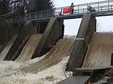 Crooks Hollow Dam with all 4 spillways in action on March 14, 2010. On this day, HCA's upstream measuring station at Christie Conservation Area recorded 67.5 mm of rain.[1]