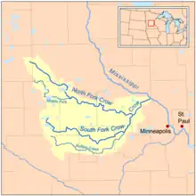 The Crow River is a tributary of the Mississippi River in south-central Minnesota in the United States. It drains a watershed of 2,756 square miles (7,140 km2).[2]