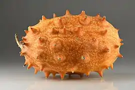 Cucumis metuliferus, commonly called the African horned cucumber, horned melon, spiked melon, jelly melon, or kiwano, is an annual vine in the cucumber and melon family Cucurbitaceae. Its fruit has horn-like spines, hence the name "horned melon". The ripe fruit has orange skin and lime-green, jelly-like flesh. C. metuliferus is native to Southern Africa,[1][2] in South Africa, Namibia, Botswana, Zambia, Zimbabwe, Mozambique, and Angola.