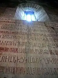 Covering the walls of churches and monasteries with ornamented texts in Armenian developed in Artsakh, and in many other places in historical Armenia, into a unique form of decor.[79] Compared with other Armenian lands, Artsakh contains a very large number of Armenian lapidary (inscribed in stone) texts per unit of territory, which date from the 5th century. The most notable and extensive of those cover entire walls of the Dadivank and Gandzasar monasteries.
