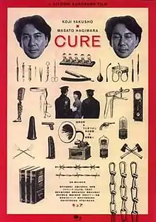 Cure (キュア, Kyua) is a 1997 Japanese psychological horror film written and directed by Kiyoshi Kurosawa, starring Kōji Yakusho, Masato Hagiwara, Tsuyoshi Ujiki and Anna Nakagawa. The story follows a detective investigating a string of gruesome murders where an X is carved into the neck of each victim, and the murderer is found near the victim of each case and remembers nothing of the crime. It is considered a progenitor of the explosion of Japanese horror media in the late 1990s and early 2000s, preceding other releases like Hideo Nakata's Ring and Takashi Shimizu's Ju-On: The Grudge.[1]