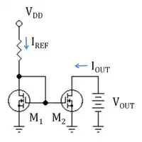 The drain current of a MOSFET ID is a function of both the gate-source voltage and the drain-to-gate voltage of the MOSFET given by ID = f (VGS, VDG), a relationship derived from the functionality of the MOSFET device. In the case of transistor M1 of the mirror, ID = IREF. Reference current IREF is a known current, and can be provided by a resistor as shown, or by a "threshold-referenced" or "self-biased" current source to ensure that it is constant, independent of voltage supply variations.[1]
