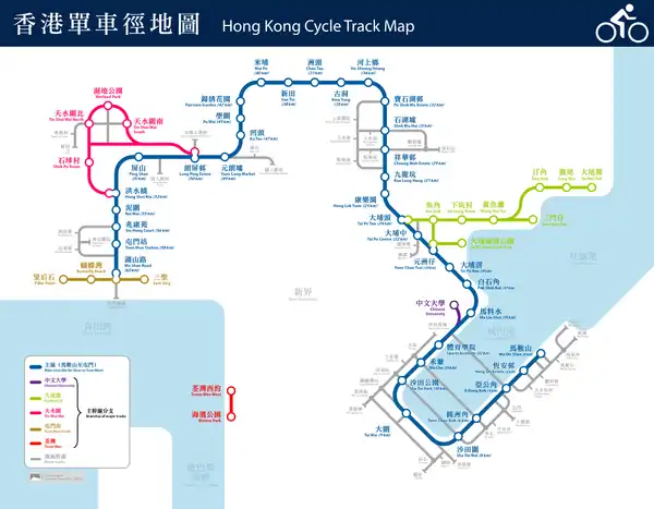 Map showing major cycling tracks in New Territories