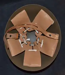The helmet is noted for its simplistic design compared to other helmets of its time, being described by collectors as a distinct egg shape. The liner contained five leather pads attached directly to the shell by means of a single split pin for each pad, and the leather chinstrap (canvas chin straps were also known to be used) attaching by the same means on opposite sides of the shell. The basic coloring of the shell was a greenish brown, post Second World War the helmets would commonly be painted black and used with fire brigades and civil defense.