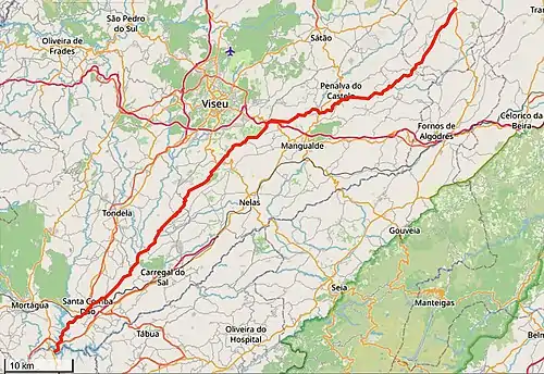 It flows in a general northeast–southwest direction, passing through Barragem de Fagilde and crosses or demarcates the limits of the councils of Aguiar da Beira, Penalva do Castelo, Mangualde, Viseu, Carregal do Sal, Nelas, Tondela, and Santa Comba Dão. It empties into the Mondego River, in the limits of the councils of Santa Comba Dão, Mortágua, and Penacova, after covering about 100 kilometres (62 mi).