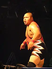 On August 11, 2013, All Japan Pro Wrestling announced that Brown would be returning to the promotion the following month to take part in the 2013 Ōdō Tournament.[21] Brown returned to the promotion on September 11 in a non-tournament tag team match, where he and Bambi Killer defeated Burning (Atsushi Aoki and Yoshinobu Kanemaru), with Brown pinning Kanemaru for the win.[22] Three days later, Brown was eliminated by Kanemaru in his first round match in the Ōdō Tournament.[23] For the rest of the tour, which lasted until September 23, Brown worked midcard tag team matches, suffering pinfall losses in most of them.[24][25][26][27] On October 3, Brown was announced also for All Japan's next tour, which started October 12.[28] Brown continued teaming regularly with Bambi Killer, which eventually led to the two forming a heel stable named DK (Dark Kingdom) under the leadership of Kenso on November 21.[29][30]