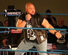 On the March 7, 2013, episode of Impact Wrestling, Brown attacked Kurt Angle and revealed himself as the Vice President of Aces & Eights, turning heel in the process.[19] Three days later at Lockdown, Brown interfered in Angle's steel cage match against fellow Aces & Eights member Wes Brisco, costing Angle the match. Later that evening, the President of the Aces & Eights was revealed to be Bully Ray.[19] Brown wrestled his first televised match in four years on the May 2 episode of Impact Wrestling, losing to Kurt Angle in an I Quit Match.[20] As a result of his loss, Brown was demoted to a prospect the following week. On July 17, Brown announced his release from TNA.[1]