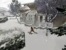 D2 was the first M2 game for which screenshots from a playable version were released to the public.[5] Warp employed their usual unorthodox promotional tactics during development. For the first two days of the April 1997 Tokyo Game Show, Warp did not show any games, instead holding a celebration of the arrival of the cherry blossom season at their booth, before finally showing a demo of D2 on the third (and final) day of the show.[6] Though at the time it was believed that D2 was nearly complete when Panasonic officially announced that the M2 was not going to be released,[7] Eno later revealed the game was "about 50 percent finished".[2] Following the abandonment of the M2, Warp began work on porting the game to the Sega Saturn.[8] However, eventually Kenji Eno decided to abandon the original concept and create an entirely new game for the Dreamcast.[2]
