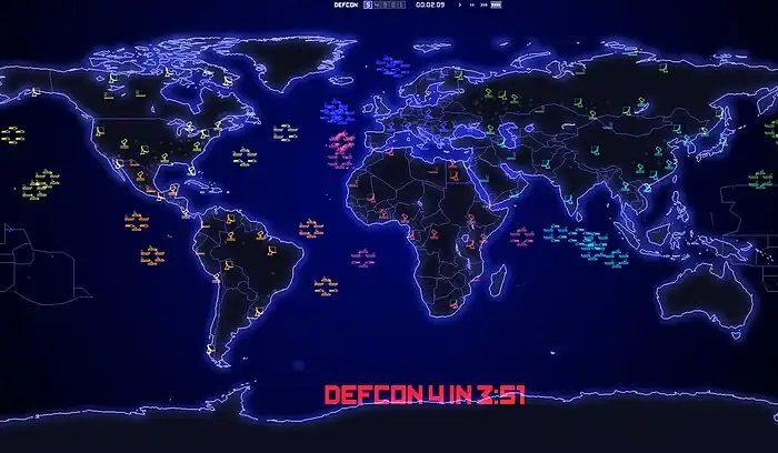 Player(s) are presented with a battlefield-management map, displaying their own, as well as opponents's units of missile silos, radar stations, naval fleets and other military infrastructure as DEFCON level decreases.