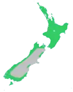 Rimu grows throughout New Zealand, in the North Island, South Island and Stewart Island/Rakiura.[4] This species is common in lowland and montane forest.[4] Although the largest concentration of trees is now found on the West Coast of the South Island, the biggest trees tend to be in mixed podocarp forest near Taupō (e.g., Pureora, Waihaha, and Whirinaki Forests). A typical North Island habitat is in the Hamilton Ecological District, where Fuscospora truncata and rimu form the overstory. Associate ferns on the forest floor are Blechnum discolor, Blechnum filiforme, Asplenium flaccidum and Hymenophyllum demissum.[5] An 800-year-old rimu tree can be seen at the Otari-Wilton's Bush in Wellington.[6]