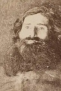 The following day, April 11, Morgan’s body, wrapped in a wool-bale bag, was brought into Wangaratta and placed on public display in a police cell. Later that afternoon the body was removed to a shed where Dr. Henry of Benalla flayed the beard and underlying skin from the corpse’s face using a clasp knife provided by Francis Cobham, Superintendent of Police at Benalla. Also present were Dr. Dobbyn, the District Coroner, and Dr. Mackay of Tarawingee. Dr. Henry then severed Morgan’s head from his trunk. The remaining hair was then shaved from the head, it was washed in hot water and a plaster cast made.[12][58][59] In May 1865 it was reported that the Attorney General of Victoria had suspended both Dr. Dobbyn ("for removing the head of Morgan") and Superintendent Cobham ("for the part he took in reference to the beard"), however both suspensions were only temporary.[59] A later report states the skin and beard from Morgan’s face was made into a tobacco pouch.[60]