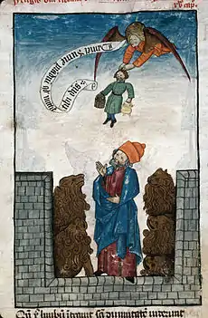 Daniel in the lions' den (chapter 6 of the Book of Daniel) tells of how the biblical Daniel is saved from lions by the God of Israel "because I was found blameless before him" (Daniel 6:22).[2] It parallels and complements chapter 3, the story of Shadrach, Meshach, and Abednego: each begins with the jealousy of non-Jews towards successful Jews and an imperial edict requiring them to compromise their religion, and concludes with divine deliverance and a king who confesses the greatness of the God of the Jews and issues an edict of royal protection.[3] The tales making up chapters 1–6 of Daniel date no earlier than the Hellenistic period (3rd to 2nd century BC)[4] and were probably originally independent, but were collected in the mid-2nd century BC and expanded shortly afterwards with the visions of the later chapters to produce the modern book.[5]