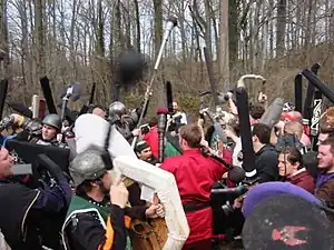 Shields are ½" pieces of plywood (¼" for bucklers) wrapped in hard- and soft-cell foam and covered with cloth. Any weapon (save for the Arrow of Piercing relic) may be deflected by a shield and cause no damage as long as the weapon does not solidly strike the individual before or after contact with the shield. Shields may be destroyed by a halberd, certain-sized two-handed axes, or via the Mace of Disruption relic in three solid hits, or the Javelin of Lightning relic in one hit. Additionally, certain magic spells such as Warp Wood or Lightning Bolt destroy shields.