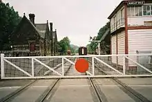 In its latterday BR guise, the signal box was located on the south side of the level crossing (up side) and there was a lattice footbridge immediately north of the crossing. The signal box disappeared after closure and the footbridge was eventually removed for use on a heritage railway. Under Peak Rail auspices, a signal box (originally at Bamford but relocated from the erstwhile Buxton steam centre) was sited at the southern end of the Up platform (see pictures), with a level crossing (Station Road) just beyond it. This signal box was merely of cosmetic use, with the crossing controlled by a crossing keeper's hut at road level (located on the Down side, and across the road from the station). In March 2008, the crossing keeper's hut was replaced by a more extensive new structure built in a traditional style, required as part of the increased signalling equipment on the railway. The latter has, in effect, split the operation into three controlled sections, permitting better timetabling and more efficient services, while also providing the necessary infrastructure to cater for extensions to the present line. The raised signal box was dismantled on 14 January 2014, the upper half being removed for further use at Rowsley, the lower section being judged unfit for further use and dismantled. As the original footbridge has subsequently been re-acquired and returned, the plan is that it will take its old position in due course.