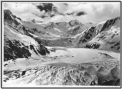 While the upper Dart Valley and headwaters of Te Awa Whakatipu were a prominent source of Pounamu for early Māori, there are no oral records of the Dart Glacier from this early exploration. The first confirmed European sighting of the glacier came from Patrick Quirk Caples, a prospector exploring the area for gold during the 1860s.[5] The glacier was further explored in the 1910s by Bernard Head, who led an expedition over the nearby Cascade Saddle before returning three years later to survey the upper Dart Valley. This expedition was the first to note the retreat of the glacier, which by the time of further studies in the 1970s had caused the Dart to retreat by more than 2 kilometres (1.2 mi).[5] Researchers studying the glacier in the 1970s were based out of a small hut which had been helicoptered into the area to the support the study, and which was removed following its conclusion.[3] This work claimed that, at the rate of retreat they observed, they claimed that the glacier below the icefall would have disappeared by the year 2000.[3] Recent study of the Dart has involved sampling rocks from in front of the retreating glacier to determine exposure to cosmic rays.[5]
