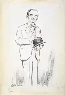 John Gunther called Low "the greatest caricaturist in the world".[5] In 1937, Nazi Propaganda Minister Joseph Goebbels told British Foreign Secretary Lord Halifax that British political cartoons, particularly those of Low's, were damaging Anglo-German relations. In 1937 Low had produced an occasional strip about "Hit and Muss" (Hitler and Mussolini), but after Germany made official complaints he substituted a composite dictator, "Muzzler".[6] After the war, Low is said to have found his name in The Black Book, the list of those the Nazis planned to arrest in the aftermath of an invasion of Great Britain.[7]