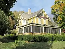 Around 1885 David and Jane had Henry C. Koch of Milwaukee design the house pictured. The style is Queen Anne, at that time considered more progressive and comfortable than the Carpenter Gothic and Italianate styles that preceded it. Its limestone foundation supports frame walls covered with cedar siding. Typical of Queen Anne, the gable peaks are decorated with fish-scale shingles and sunburst patterns. The gable ends are framed in bargeboards. Some of the windows are multi-pane leaded glass. The current porch on the south was built around 1900, replacing the original porch which was smaller and more elaborate with one in the simpler style of late Queen Anne. Inside, the first floor has a side-hall plan, with a marble fireplace in the living room and pocket doors between some rooms. Upstairs are bedrooms and a bathroom.[3]