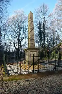 De Naald is the name the locals have given the monument. The 'needle' has often been mistaken for the border mark between Heemstede and Bennebroek, but in fact the border is further south. nl:David Jacob van Lennep (classicus), who lived in the 'Huis te Manpad' behind the monument, was a Dutch poet and professor of classical languages in Amsterdam. His son, Jacob van Lennep, who was 15 at the time of the monument's placement, later wrote a song commemorating 'Witte van Haemstede', one of the heroes mentioned on the monument. Later historians have questioned whether these events did in fact take place, and also whether the location is correct.[1] The Manpad was a generic name for the North-South route along the Dune ridge running from The Hague to Alkmaar. In most towns the road took on the name of Hoofdweg, the equivalent of 'Main Street'. This particular stretch of Manpad actually runs East-West, crossing the Leidsevaart from one sand ridge to another. The battles, if they took place, could have taken place anywhere along the Manpad. It is unlikely that Witte van Haemstede would reach Haarlem via the Manpad from Zandvoort, as the legend has it. The most direct route to Haarlem from Zandvoort is via the Visserspad.