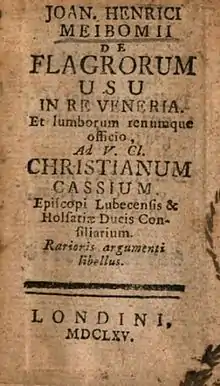 Tractus de usu flagrorum in re Medica et Veneria is a 1639 treatise by Henricus Meibomius (1590–1655). The English title is A Treatise on the Use of Flogging in Medicine and Venery. It was published by the English publisher Edmund Curll.