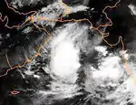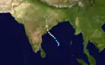 On June 1, an area of low pressure developed over the Laccadive Islands. Two days later, the JTWC issued a TCFA for the system as it became better organized. Early on June 4, the JTWC issued its first advisory on Tropical Cyclone 03A.[6] Around the same time, the IMD began monitoring the system as Depression ARB 02. Shortly after, the depression was upgraded to a deep depression and further strengthened into a cyclonic storm the following day.[15] The small storm moved slowly towards the west and weakened as wind shear began to increase. The storm weakened below tropical storm intensity later that day and the initial final advisory was issued. However, the system redeveloped and advisories resumed the next day. The storm gradually intensified as it moved towards the northwest. Dvorak satellite intensity estimates on June 6 reached T4.0, corresponding to an intensity of 120 km/h (75 mph).[25] The IMD also marked the increase in intensity, upgrading ARB 02 to a severe cyclonic storm.[15] Around this time, the storm began to turn towards the north and accelerate due to an approaching mid-level trough. As the storm neared the Indian coastline, an eye developed and the storm strengthened into the equivalent of a major hurricane with winds reaching 185 km/h (115 mph).[6] The IMD assessed the storm to be a very severe cyclonic storm at this time, with winds up to 165 km/h (103 mph) and a barometric pressure of 958 mbar (hPa).[15] After slightly weakening early on June 9,[25] 03A re-strengthened, attaining its peak intensity with winds of 195 km/h (121 mph).[6] Then it made landfall near Porbandar in the Indian state of Gujarat[25] between 0100 and 0200 UTC.[15] The storm weakened following landfall and the JTWC issued their final advisory later that day.[6] The IMD continued to monitor ARB 02 until June 10, by which time it had weakened to a depression before dissipating.[15]