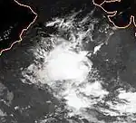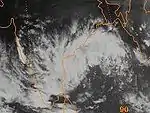 On November 10, an area of low pressure developed over the Bay of Bengal within a monsoonal trough. Moving towards the northwest,[44] the low gradually developed and the JTWC issued a TCFA early on November 13. The next day, the first advisory on Tropical Cyclone 06B was issued.[10] A brief period of rapid development took place as the storm strengthened just below Category 1 status. Shortly before making landfall near Visakhapatnam,[44] 06B reached its peak intensity with winds of 155 km/h (96 mph).[10] At this time, the IMD classified the cyclone as a Very Severe Cyclonic Storm and reported that it had a 60 km (37 mi) wide eye.[45] Rapid weakening followed shortly after landfall and the storm dissipated early on November 16.[10][44]