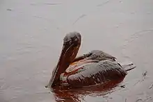 The oil dispersant Corexit, previously only used as a surface application, was released underwater in unprecedented amounts, with the intent of making it more easily biodegraded by naturally occurring microbes. Thus, oil that would normally rise to the surface of the water was emulsified into tiny droplets and remained suspended in the water and on the sea floor.[194] The oil and dispersant mixture permeated the food chain through zooplankton.[191][195][196] Signs of an oil-and-dispersant mix were found under the shells of tiny blue crab larvae.[197] A study of insect populations in the coastal marshes affected by the spill also found a significant impact.[198] Chemicals from the spill were found in migratory birds as far away as Minnesota. Pelican eggs contained "petroleum compounds and Corexit".[129] Dispersant and PAHs from oil are believed to have caused "disturbing numbers" of mutated fish that scientists and commercial fishers saw in 2012, including 50% of shrimp found lacking eyes and eye sockets.[199][200] Fish with oozing sores and lesions were first noted by fishermen in November 2010.[201] Prior to the spill, approximately 0.1% of Gulf fish had lesions or sores. A report from the University of Florida said that many locations showed 20% of fish with lesions, while later estimates reached 50%.[201] In October 2013, Al Jazeera reported that the gulf ecosystem was "in crisis", citing a decline in seafood catches, as well as deformities and lesions found in fish.[202] According to J. Christopher Haney, Harold Geiger, and Jeffrey Short, three researchers with extensive experience in environmental monitoring and post-spill mortality assessments, over one million coastal birds died as a direct result of the Deepwater Horizon spill. These numbers, coupled with the National Audubon Society scientists' observations of bird colonies and bird mortality well after the acute phase, have led scientists to conclude that more than one million birds ultimately succumbed to the lethal effects of the Gulf oil spill.