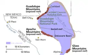 Exposed and buried parts of Capitan Reef. Blue area shows area once flooded by the Delaware Sea.
