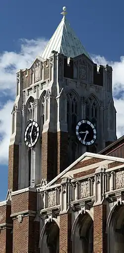 The school has a 120-ft clock tower which features eight buttresses. Its face was designed by Carl Shroer, a teacher at Central High School, and was completed by Denfeld students who welded together four sections cast in aluminum by the Duluth Brassworks Company. The numbers on the face were painted silver and the clock hands were gold painted wood. The face was later painted black, in order to make it more easily visible from Grand Avenue.
