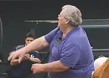 After the Tigers had clinched the 1968 American League pennant, McLain added to his penchant for notoriety while pitching his 31st and final regular season victory in a game against the Yankees on September 19.[4] McLain had grown-up idolizing New York Yankee center fielder Mickey Mantle, who entered the game tied with Jimmie Foxx for third place in the major-league career home runs list.[21] When Mantle—who was nine days away from his last major league appearance—came to bat in the eighth inning with the Tigers leading 6–1, McLain intentionally threw a soft pitch directly over home plate.[21] Other accounts said that he called catcher Jim Price to the mound and had him tell Mantle that he would be throwing only fastballs.[22] Mantle hit the pitch for his 535th career home run (the penultimate home run Mantle would hit in his career), putting him in sole possession of third place on the all-time home run list, behind only Babe Ruth and Willie Mays. As Mantle ran around the bases, McLain stood on the pitcher's mound and applauded.[5] Mantle tipped his hat to McLain as he rounded the bases.[22] The next batter, Joe Pepitone, waved his bat over the plate, as if asking for an easy pitch of his own. McLain responded by throwing the next pitch over Pepitone's head.[23] After the game, McLain smilingly denied that he had served up an easy pitch for Mantle to hit; however, he was later reprimanded by Major League Baseball Commissioner William Eckert.[4][21]