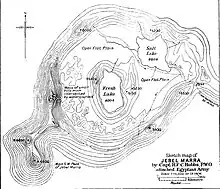Jebel Marra consists of a pile of mostly basaltic lava which has been covered by pumice and volcanic ash as well as pyroclastic rocks and ignimbrites.[33] The Deriba caldera which forms the top of the entire complex,[34] which around Deriba has the appearance of a large ash cone[35] or shield volcano.[36] Other, less spectacular vents are found elsewhere in the Marra Mountains. Erosion has cut canyons into the volcanic complex.[37] The occurrence of volcanism has been explained with a mantle plume centered between Meidob and Jebel Marra.[38]