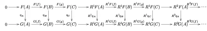 Second, suppose η : FG is a natural transformation from the left exact functor F to the left exact functor G. Then natural transformations Riη : RiFRiG are induced, and indeed Ri becomes a functor from the functor category of all left exact functors from A to B to the full functor category of all functors from A to B. Furthermore, this functor is compatible with the long exact sequences in the following sense: if