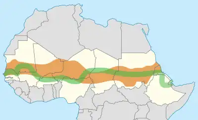 The impact of climate change and human activities on desertification are exemplified in the Sahel region of Africa. The region is characterized by a dry hot climate, high temperatures and low rainfall (100–600 mm per year).[16] So, droughts are the rule in the Sahel region.[17] The Sahel has lost approximately 650,000 km2 of its productive agricultural land over the past 50 years;[18] the propagation of desertification in this area is considerable.[19][20]