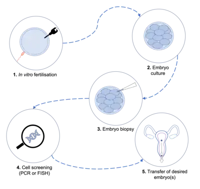 - ↑ Sermon K, Van Steirteghem A, Liebaers I (May 2004). "Preimplantation genetic diagnosis". Lancet. 363 (9421): 1633–1641. doi:10.1016/S0140-6736(04)16209-0. PMID 15145639. S2CID 22797985.