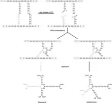 The formation of desmosines occurs within the formation of precursor tropoelastin. The tropoelastin initially lacks any of these complex binding molecules, and has a similar make up to that of the final stage elastin, however it contains a greater amount of lysine side chains, which directly corresponds with desmosines later found. These precursor molecules are processed through Dehydrogenation, along with dihydroD, and ultimately form elastin bound with desmosine.[5] Through the Lysyl oxidase enzyme, lysyl c- amino groups is oxidized, forming allysine. This spontaneously condenses with other allysine molecules to form a bifunctional cross-link, allysine aldol, or with a c-amino group of lysine, forming dehydrolysinonorleucine. These compounds are then further condensed to form a tetrafunctional pyridinium cross-links of desmosines and isodesmosines.[3] These reactions occur with lysines in areas of high alanine, due to alanine having a small side chain that won't block the enzyme binding to the lysine groups.