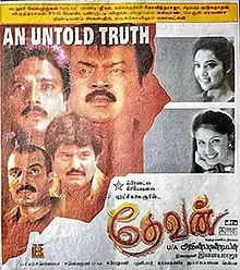 Devan is a 2002 Indian Tamil-language action film directed by Arun Pandian making his debut as director. The film stars himself in the title role being his 50th project as actor[1] with Meena and Kausalya , while Vivek and Malayalam actor Sai Kumar play supporting roles. Actors Vijayakanth, Karthik and Senthil appear in guest appearances. Sai Kumar had made his Tamil debut with this film. The music was composed by Ilaiyaraaja. The film was released on 14 June 2002 and was also dubbed in Hindi as Vidrohi.[2]