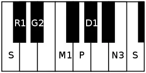 It is the 3rd rāgam in the 2nd chakra Netra. The mnemonic name is Netra-Go. The mnemonic phrase is sa ri ga ma pa dha ni.[1] Its ārohaṇa-avarohaṇa structure (ascending and descending scale) is as follows (see swaras in Carnatic music for details on below notation and terms):
