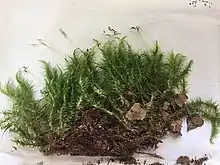 Another distinguishing feature is aggregated sporophytes, with 1-10 capsules produced from a single perichaetium [2] (see Figure 2). Setae are light brown and project 0.5-1.0 cm above the perichaetium.[2] Perichaetial leaves are strongly tapered, and grow to about a quarter of the length of the seta.[1][3] Capsules are cylindrical, smooth and narrow, and grow 3–3.5 mm in length.[1]