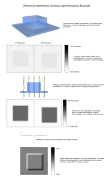 4. The rays travel through adjacent areas of the sample, separated by the shear. The separation is normally similar to the resolution of the microscope. They will experience different optical path lengths where the areas differ in refractive index or thickness. This causes a change in phase of one ray relative to the other due to the delay experienced by the wave in the more optically dense material.