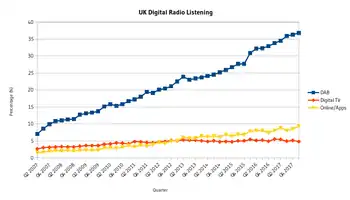 In the UK, 65.8% of all radio listening hours by the third quarter of 2021 were through digital platforms, with DAB making up the majority of digital radio listening (65.3% of digital radio listening).[5] In the first quarter of 2020, 66.7% of UK people aged 15+ claimed to have access to a DAB radio set at home.[6]