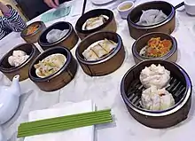 Dim sum restaurants typically have a wide variety of dishes, usually totaling several dozen.[11][12] The tea is very important, just as important as the food.[13][14] Many Cantonese restaurants serve dim sum as early as five in the morning,[15][16] while more traditional restaurants typically serve dim sum until mid-afternoon.[15][17][18] Dim sum restaurants have a unique serving method where servers offer dishes to customers from steam-heated carts.[8][19][20] It is now commonplace for restaurants to serve dim sum at dinner and sell various dim sum items à la carte for takeout.[21] In addition to traditional dim sum, some chefs also create and prepare new fusion-based dim sum dishes.[22][23][24][25] There are also variations designed for visual appeal on social media, such as dumplings and buns made to resemble animals.[26][27]