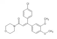 Dimethomorph is a fungicide with systemic function. It is used for treating mildew and root rot caused by organisms such as Pythium and Phytophthora species.[1]