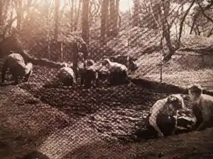 An actual project designed to excavate the hillfort was developed by professors at the newly founded archaeology department of University College, Cardiff in the mid-1950s. In 1953, archaeologists Sir Cyril Fox, Dr V.E. Nash-Williams and Dr H.N. Savoy examined a variety of sites in southern Wales to decide which would be the best training site for the university's students, and eventually came to the conclusion that the Dinas Powys hillfort would be best. After gaining permission to excavate from Sir Herbert Merrett of the Cwrt-yr-Ala Estate Company and the Forestry Commission (the owners and tenants of the land respectively), and getting a small monetary grant from the Board of Celtic Studies, excavation began in January 1954.[27] The excavations continued for four years, till 1958, mostly at weekends in spring and early summer, and also at Easter from 1954 through to 1957, and during July–August 1958. Following the financial support of the Board of Celtic Studies, grants were later made for the excavation by Glamorgan County Council, the Cambrian Archaeological Association, the British Academy, the Haverfield Trustees and the Society of Antiquaries.[27] Most of the work was undertaken by volunteers, namely students from University College Cardiff, as well as from community archaeological societies both from Wales and from the rest of Britain. For the back-filling however, manual workmen were employed due to the more physical nature of the labour.[27] The excavators decided to leave certain areas unexcavated, stating that "Sufficient areas have been left unexcavated for future workers to have some chance of testing both the observation of facts and the hypotheses presented [in their conclusions]."[28]