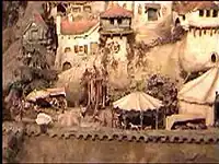 The visitors can walk around a 60 metre long show-case with mountains, little villages, castles and churches, moving trains and automobiles and flowing water. Most of the Diorama is set in day-time, but a smaller part is devoted to night-time