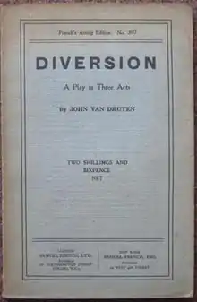 Diversion is a 1927 play by the British writer John Van Druten. It was first staged in the United States at the Lyceum Theatre in Rochester before beginning a 68 run performance at the 49th Street Theatre in 1928.[1] In London it ran for a combined 101 performances at the Arts Theatre and Little Theatre between 26 September and 22 December 1928. The cast included Maurice Evans, C.V. France, Cathleen Nesbitt and Mignon O'Doherty.[2]