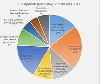 In 2011 there were 161 residents in the two parishes that were between the ages of 16 and 74 and in employment.[1] The occupations of the people usually resident at the time of the 2011 census between the ages of 16 and 74 are shown in the pie chart for 2011. The largest population percentage is Professional Occupations category with 23%. The percentage of Skilled Trades Occupations is well above the average for England of 11.4% compared to 17.4% in Docker.[1] Docker is in the countryside so this is due to the thriving agricultural industry in the area. As a result, higher qualifications may be unnecessary for the industry in Docker.